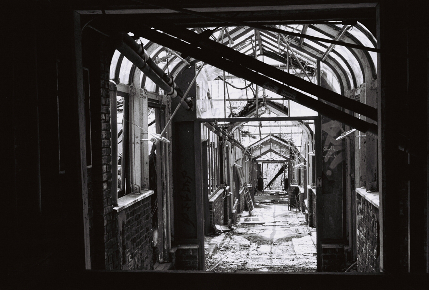 While the main building was almost entirely boarded up, anyone passing by could walk right up into the greenhouses, which were mainly a disarray of broken glass and standing puddles. After a bit of poking around, we found an entrance into a basement under the greenhouses. Normally, I steer clear of most basements, but despite being almost entirely pitch black, we could see the literal light at the end of the tunnel, which opened up into the main campus building. After thinking we were geniuses in finding this path, we ran into another urban explorer at an open gate on the ground floor of the building. This is not the first time we’ve discovered these idiocies after the fact (see Land of Oz). Most of the building has been gutted, though, except for an explosion of styrofoam plates (that we later found out was from locals feeding the feral cats). There were some half-hearted “No Tresspassing” signs, but it was obvious that no one really cared who came and went to the area – and was later confirmed by our fellow urban explorer who was local to the area.